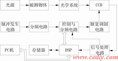本系统用于测量螺旋桨转动过程中的桨叶的偏振角。由于螺旋桨具有刚性,其转动过程中不仅存在摆动,而且存在振动,对其偏摆角的测量需要在螺旋桨转动过程中采集其瞬态的位置,利用CCD的成像特性,将螺旋桨瞬态的位置信息通过CCD成像,光信号转换为电荷信号,经过信号处理电路,转化为数字信号,传输给CPU处理。系统框图如图2所示。